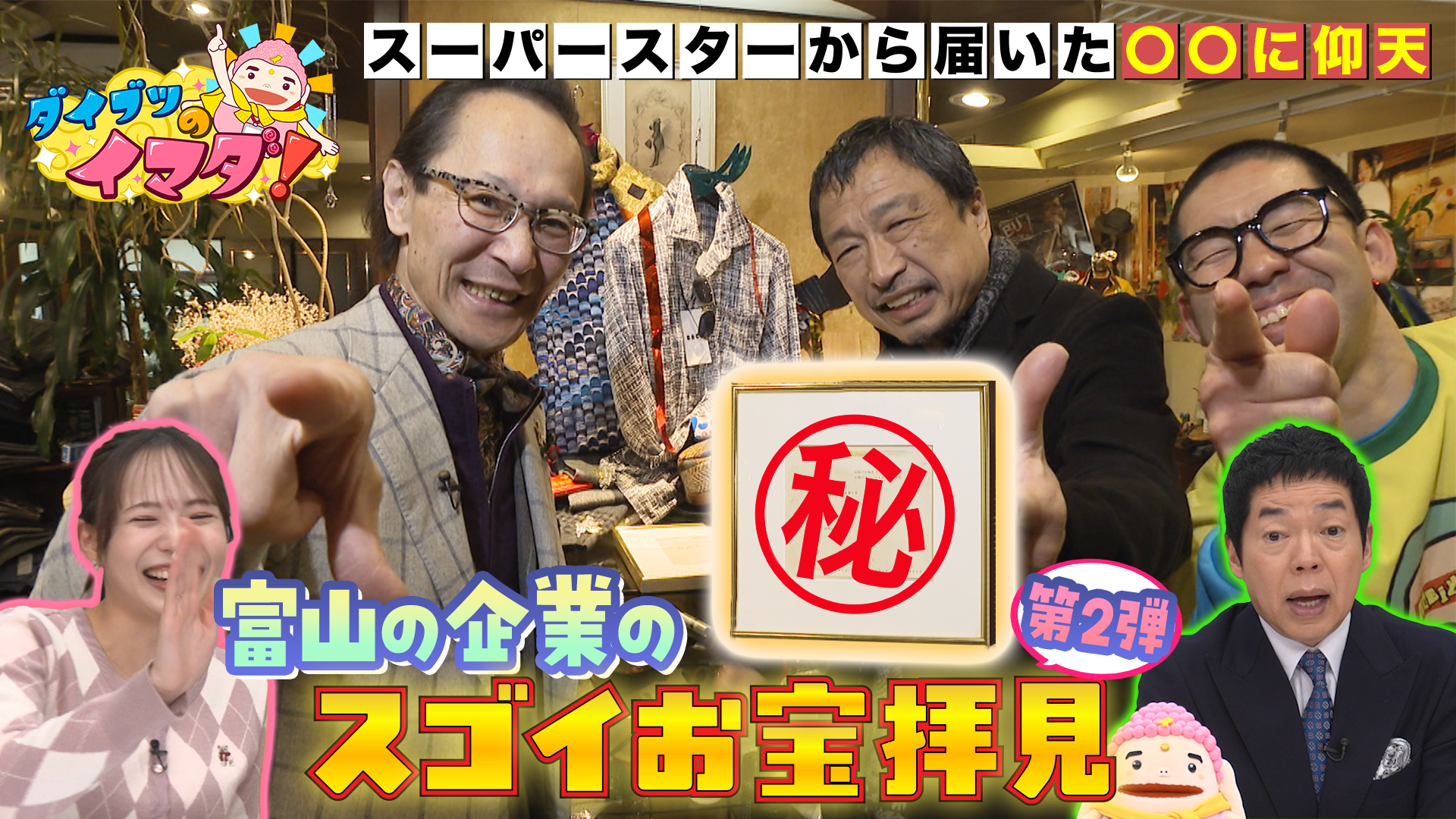 企業が持っているお宝とそのエピソードから、会社の歴史やスゴさを紐解く新企画。「しろえびせんべい」を手がける日の出屋製菓では、日本を代表する版画家の貴重な作品が続々…その訳とは?黒部市の皇国晴酒造には、大相撲に関係した逸品が登場。そして高岡市の洋服店では、あの伝説のロックスターから届いたという激レアお宝を拝見。涙なくしては語れないお宝エピソードとは?