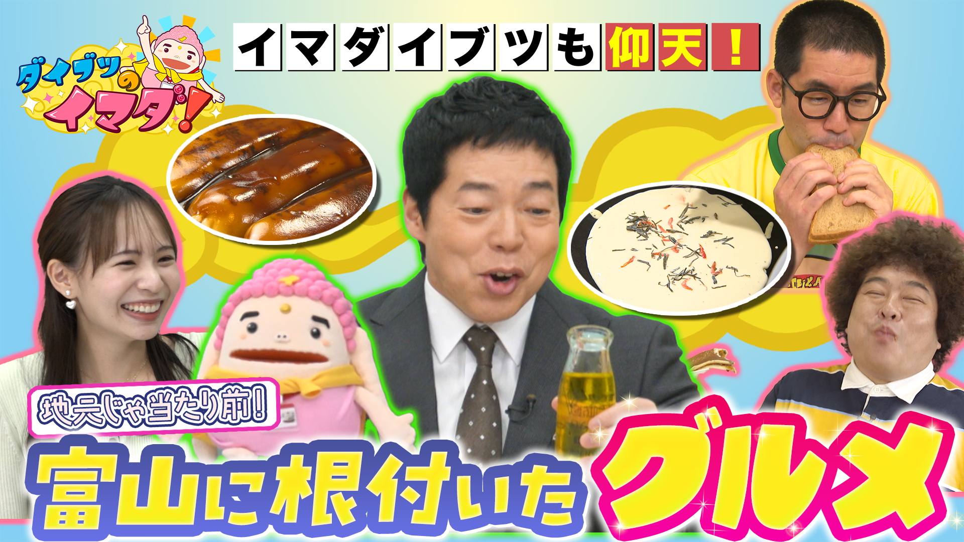 県民にとっては当たり前だが全国には知られていない、地元に根づいたグルメを調査する。昔は全国各地で製造販売されていたものの今では富山だけだという、新湊地区を中心に愛されている黄金色のドリンクや、昔からの風習を受け継いだみそ汁に入れるある食べ物など、他の地域にはない個性豊かな品が続々登場!試食したイマダイブツからも太鼓判&ありがたいお言葉が!
