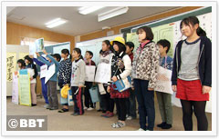 | 2月の発表会では、生きもの採取での大発見について、また川の魚と海の魚が同じ用水にすんでいる理由など、わかりやすく説明しました。自然の大切さを伝え、5年生から4年生へ、飼育のバトンリレーをしました。 | ||